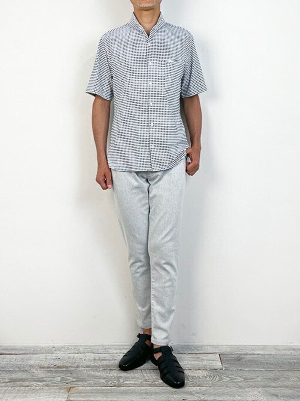 Gimgham check knit Shirt 布帛のようなギンガムニットシャツを着用しました。 張りとストレッチ性の両方があり綺麗に着用できます。 今回は同系色のPuコーティングしたテーパードパンツを合わせました。 シャツ\19,800 パンツ\38,500