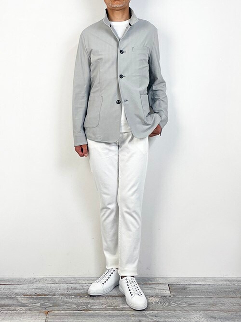 JQ knit Standcollar BZ ハイテンションニットを使用したスタンドカラーブルゾンを着用しました。 ボトムには、スリムデニムパンツを合わせました。