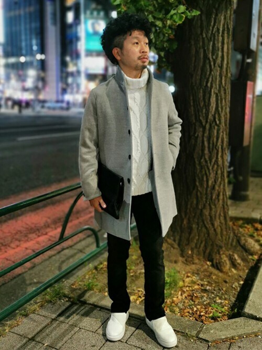 ライトグレーをモノトーンで統一コーディネートに する事で、大人のキレイめスタイルを演出。 アラン柄のタートルニットが柔らかい印象を与えてくれます。