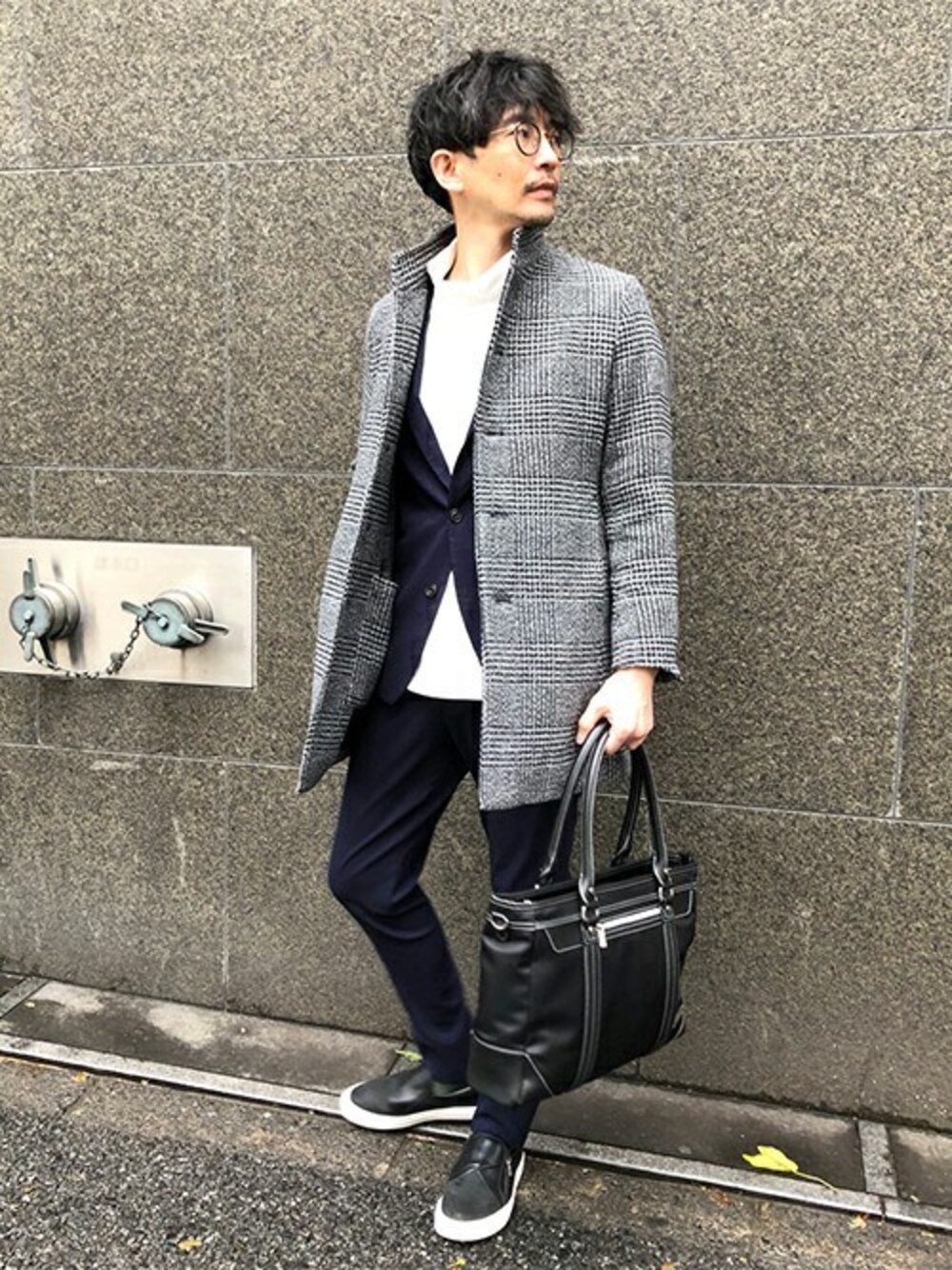 ジャケットインがしやすいサイジングなのでビジネスシーンでも大活躍! フォーマルなネイビーセットアップにグレーのグレンチェック柄でカジュアル感をプラス。 インナーはネイビー・グレーとの相性も良い白で清潔感をだした王道ビジカジコーデです。