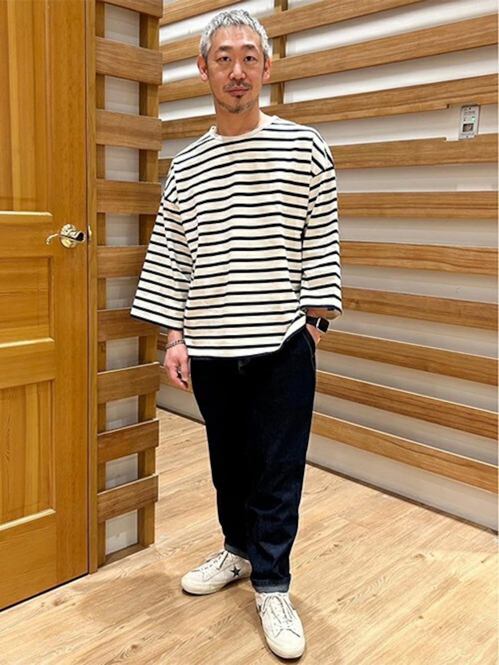 ニコルのTシャツ/カットソー「日本製 デラヴェ天竺7分袖ボーダーカットソー」を使ったコーディネート