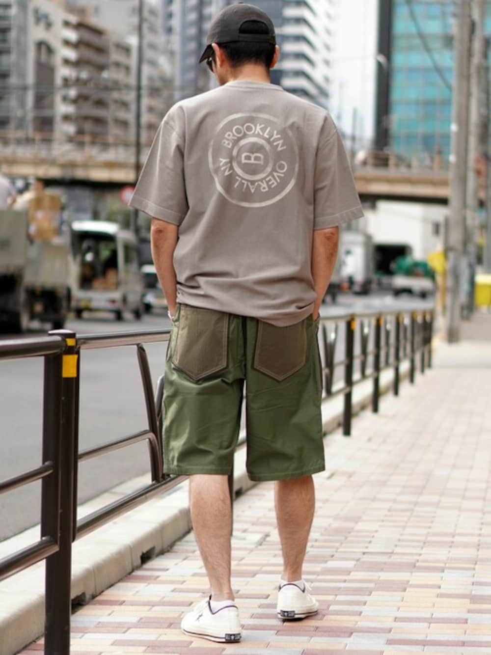背中に映えるBROOKLYNOVERALLのタックボタンのプリント。 ボディーカラーに馴染むシックな配色バックプリント。 フロントはポケット付きのシンプルなデザインの為、コーディネートしやすい1枚に仕上がっています。 素材の選定はいくつかサンプリングを試みましたが、値段と品質のバランスを考慮して結果、日本製生地で、独特なハリコシのある定番Tシャツ使用している生地になりました。 サイズ感は程よくゆとりあるシルエットで、張りのある生地の特性を活かしたシルエットになります。