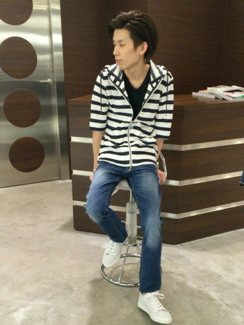 爽やかなパイル地のパーカーにウォシュ入りのデニムでコーディネート! 足元も白でまとめた、軽快なお出かけスタイルです⤴ NICOLE CLUB FOR MEN 博多阪急 Progress