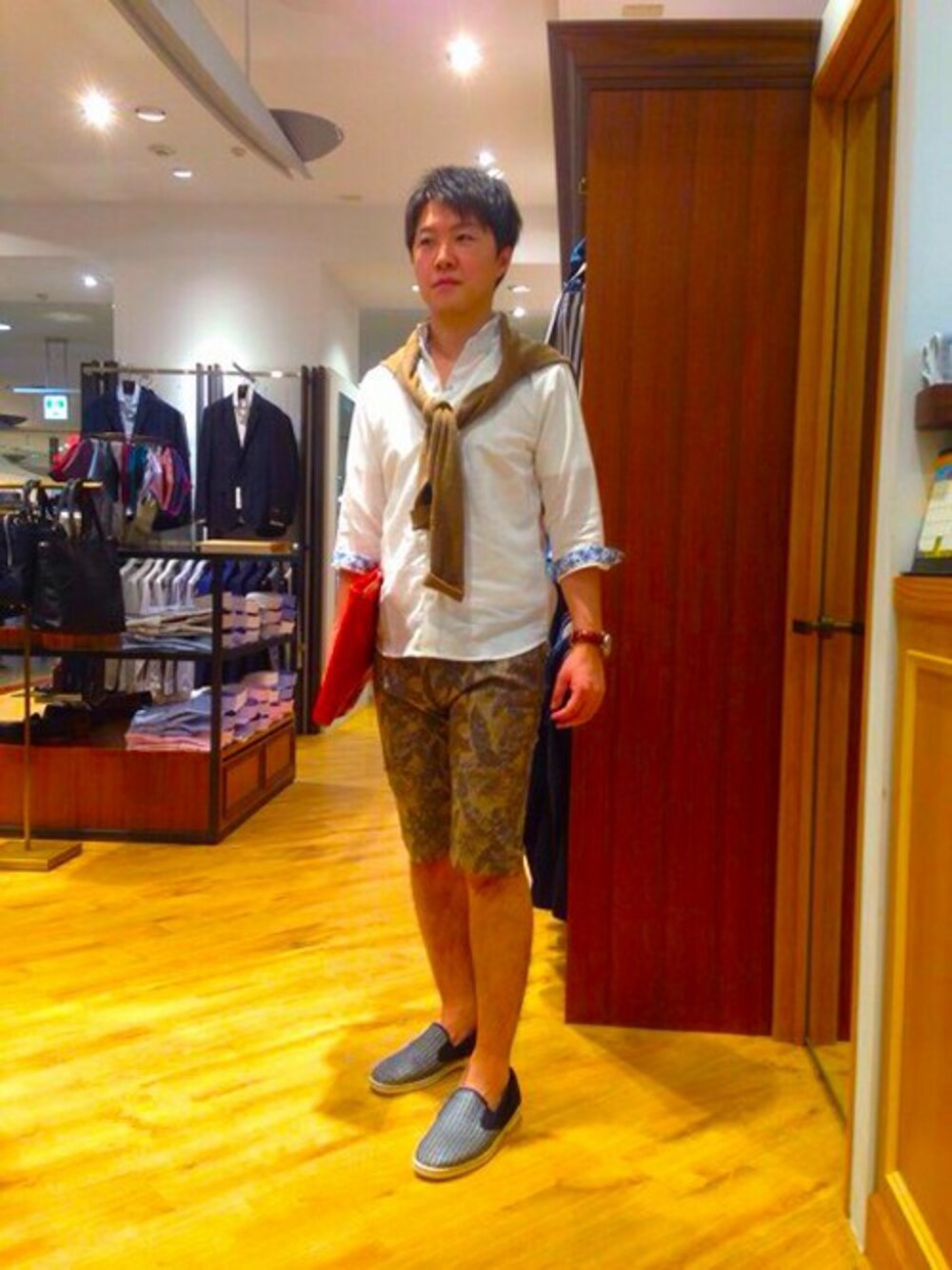 異なるカラーの糸をドビー素材を使用し、立体感のある表情が美しい7分袖シャツ。スタンドカラーがワンポイントとなり、前立て裏には釦とともにスナップ釦を施しました。袖口裏の花柄がエレガントなアクセントとなり、1枚で着こなしが楽しめます。 今回はボタニカル柄のショーツを合わせ、都会的なショーツスタイルに仕上げました。 MONSIEUR NICOLE 池袋東武百貨店