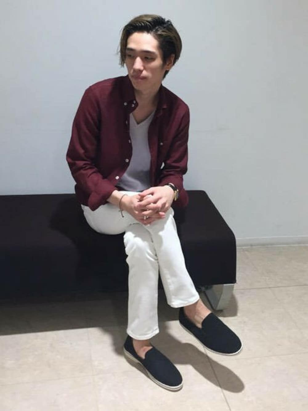 MONSIEUR NICOLE新宿マルイメン 大人リゾートコーディネート ボルドー×ホワイトでワンランク上の大人リゾートコーディネートを演出しました。 足元をブラックにすることでより格好いい雰囲気になっています。