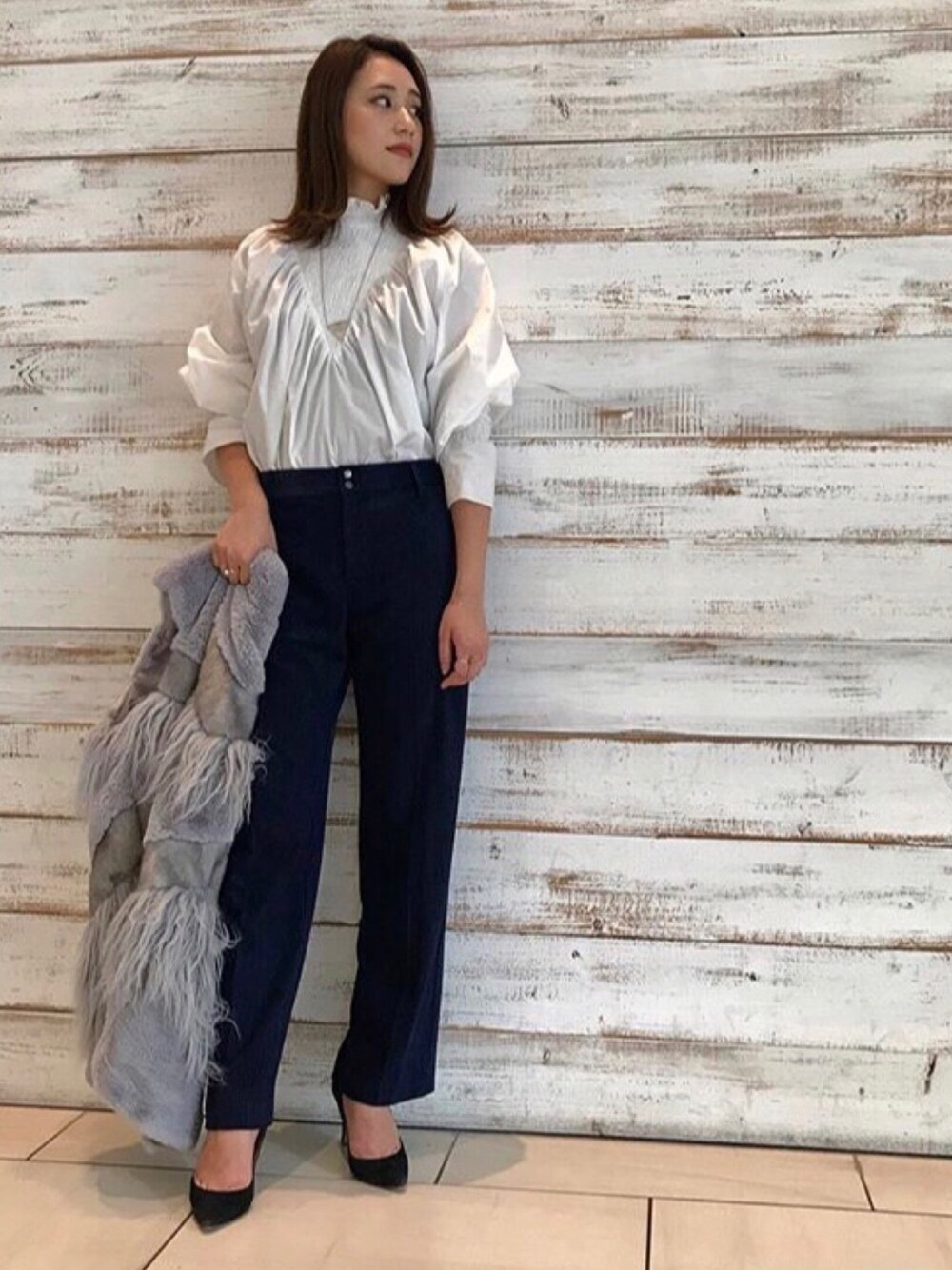 《NINEルクア大阪店》 . ☑︎NINE snap . スモッキングブラウス ¥20,520 . P/Vコーデュロイパンツ ¥19,440 . フェイクファーベスト ¥36,720