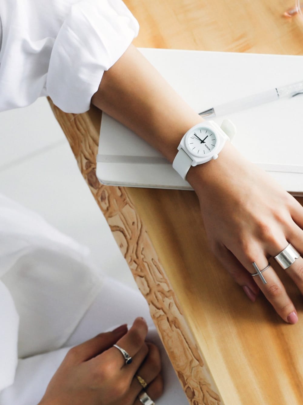 定番フォルムにサイズチェンジを施し、さらにポリカーボネイト素材を落とし込んだTHE MEDIUM TIME TELLER P(ミディアムタイムテラーP)。カッチリとしたメタル素材からPOPな印象へと一変させ、さらに女性の手首にフィットするようにサイジングへも配慮しました。思わず着けていることを忘れてしまうくらい軽やかな着け心地もポイントです。 オールホワイトコーデにもぴったりで、シルバーのアクセサリーと組み合わせればシックな印象にも。モノトーンの色合いがシンプルでコーディネートを選ばず使えるアイテム!