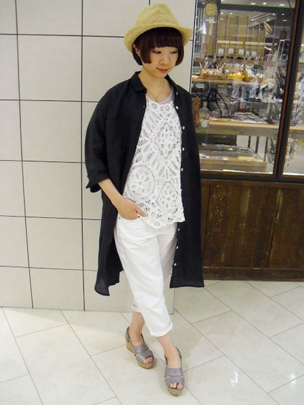 麻のシャツワンピースをアウター感覚ではおりました。 中にレースブラウスをイン、シルバーのウェッジサンダルを合わせて大人可愛いモノトーンコーデに。