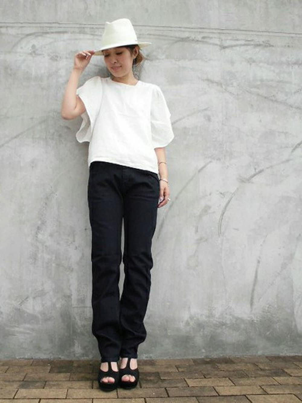 ゆったりめのピラ袖プルオーバーにバランスの良いスラックススキニーパンツ スラックスの柔らかさでリラックス感のあるコーディネートになっています。 ナチュラルになり過ぎないようにハットとウエッジサンダルを合わせています。