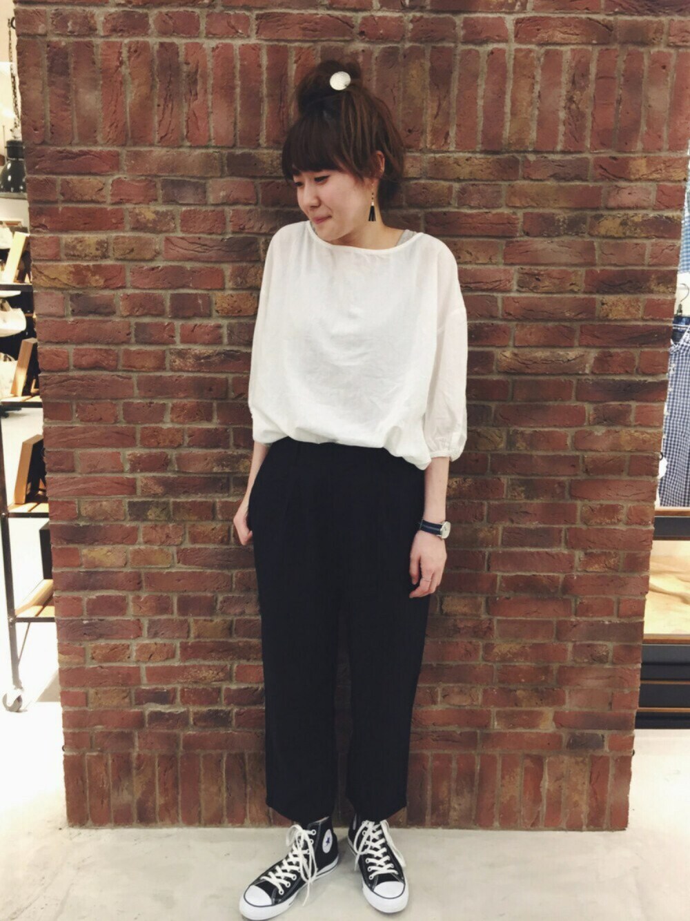 可愛らしい白のブラウスに黒のパンツとスニーカーで抜け感のあるコーディネート。 ブラウスは店舗限定商品です!