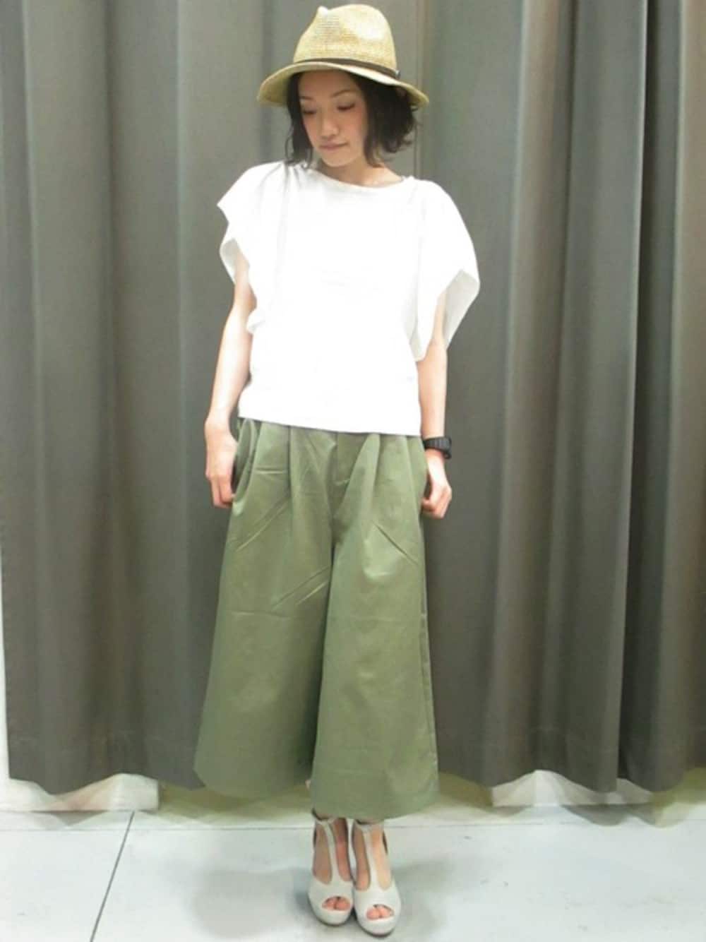 フリル袖のトップスは麻素材でナチュラルな柔らかい印象です。 スッキリしたカーキのガウチョパンツを合わせて甘辛コーデに。