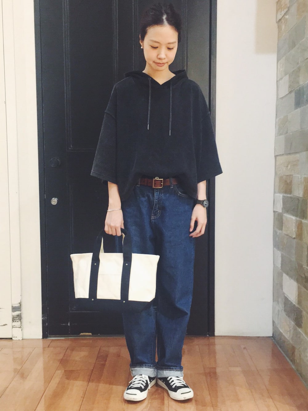 パーカ×デニムでカジュアルに。 ハイウエストのデニムは履くだけで今年らしい雰囲気になります◎
