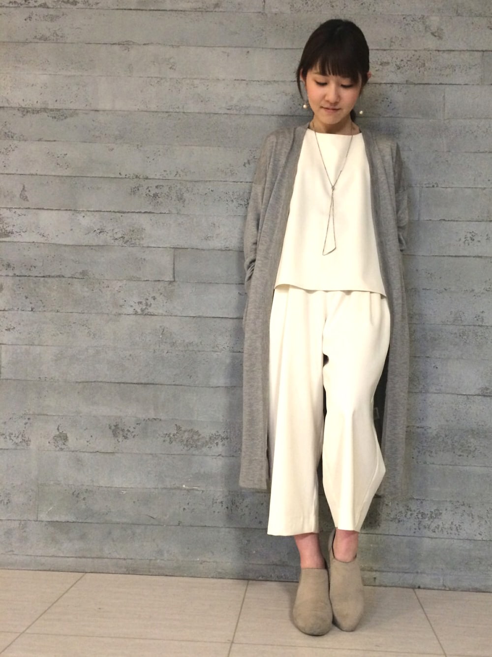 二次会等で定番のセットアップはロングカーディガンと合わせて普段使いにも。春らしく全体を淡いカラーでまとめました。