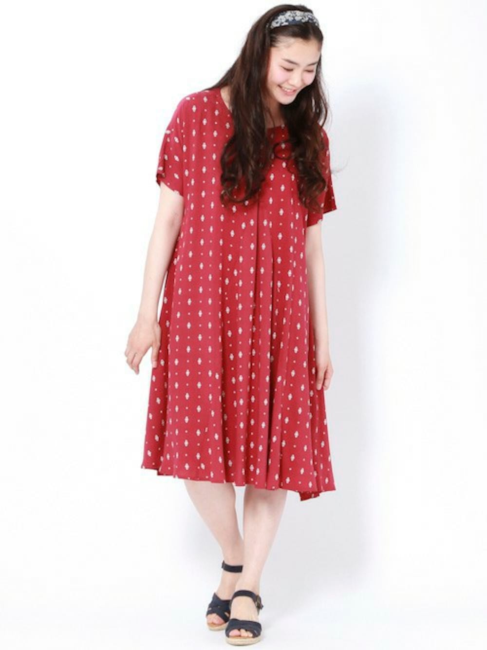 きれいな赤いカラーのワンピースが主役のコーディネート。 切替えでできるフレアのシルエットが女性らしい印象。ヘアバンドとサンダルをネイビーで合わせて統一感をだしました。