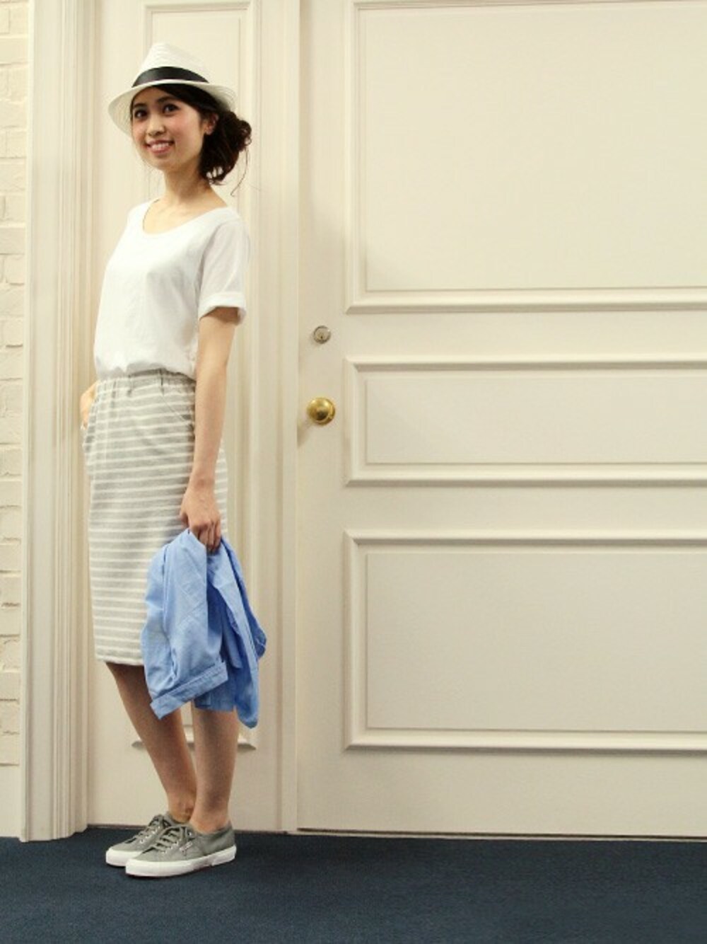 トレンドのボーダースカートに白Tを合わせたシンプルコーデ。 足元にかけてのグレーグラデーションがこなれた雰囲気。ハットをプラスして爽やかに仕上げました。