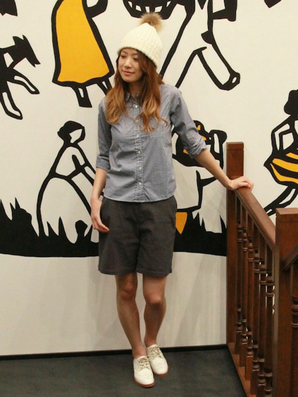 シンプルなチェックシャツに秋らしい落ち着いたショートパンツを合わせた初秋スタイル。 足元は白のレースアップシューズでトラッドな雰囲気に。ニットワッチでかわいさをプラスしました。