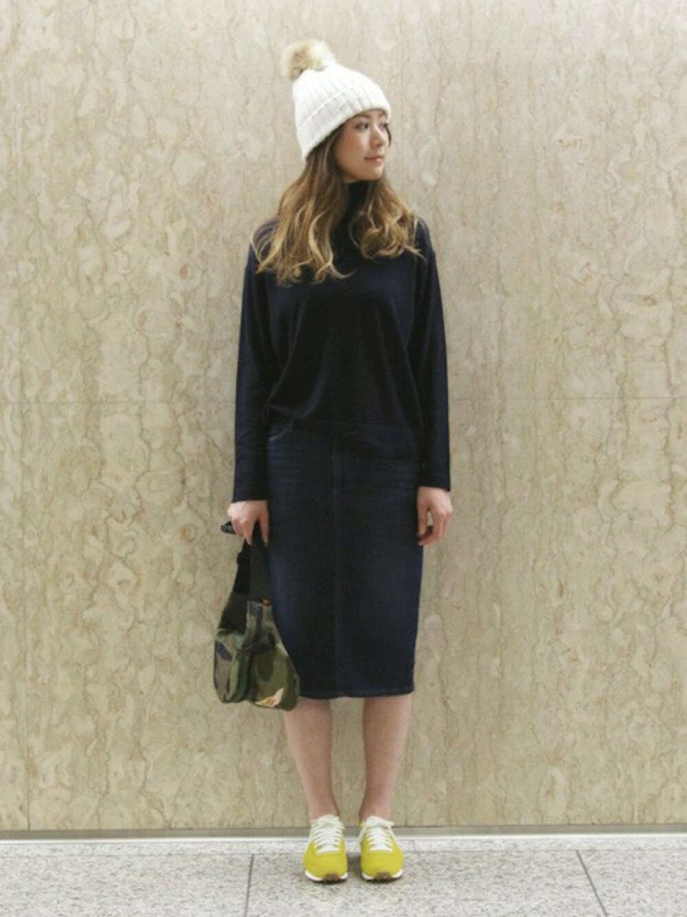 定番デニムタイトスカートとタートルネックのコーディネートは小物で遊んで。 白ニットワッチとイエローのスニーカーを合わせてネイビーグラデに明るさをプラスしました。 大人かわいいスポーティーさがポイントです。