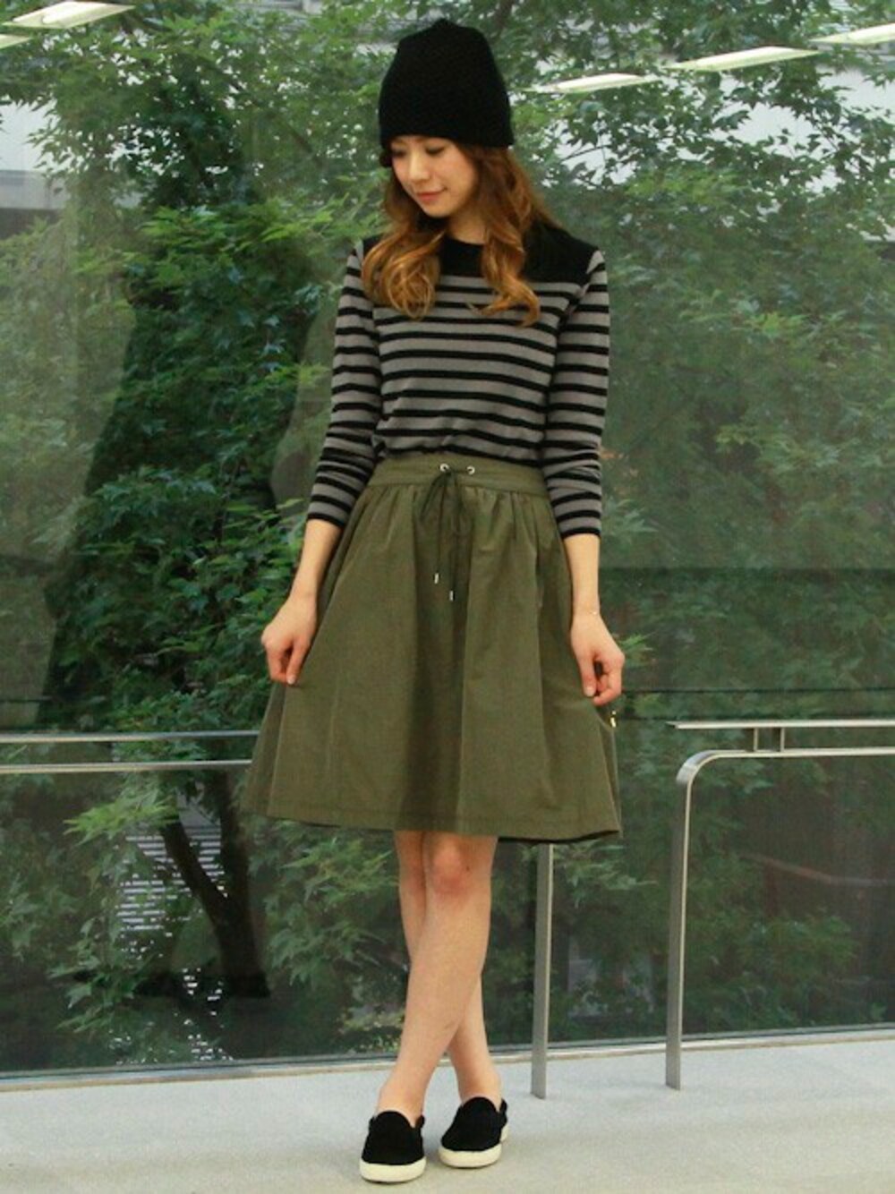 ボーダートップスにボリューム感あるスカートを合わせた大人カジュアルなコーディネート。 トレンドのチュール付ニットキャップで華やかに。ボーダーやスニーカーなどカジュアルアイテムと好相性です。