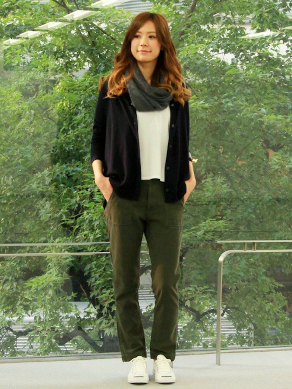 シンプルな大人カジュアルコーデ。ライン入りカーデでトラッドな雰囲気に。 今の季節はTシャツを合わせてラフに仕上げるのがおすすめです。 さびしく見える首元はスヌードをプラスして目線を上げて。