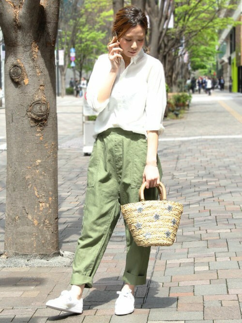 上品なきれいめシャツにラフなパンツを合わせた大人のリラックスコーディネート。 シャツはボタンを開けて、前を少しインしてやわらかい雰囲気に着くずしています。 春夏気分をあげる星モチーフのかわいいカゴバッグもポイント。