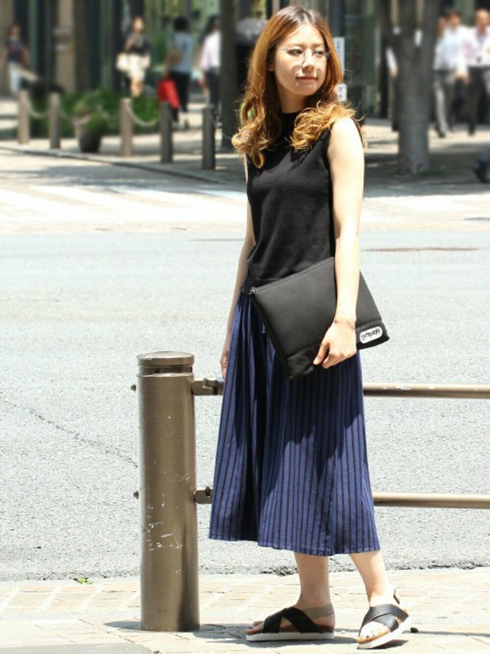 スッキリ見えるクルーネックベスト+着心地抜群のストライプガウチョパンツ ポイントのメガネはJINS×niko and...からトレンド感のあるメタルラウンドフレームをセレクト。 ブラックにまとめて大人っぽく仕上げました。