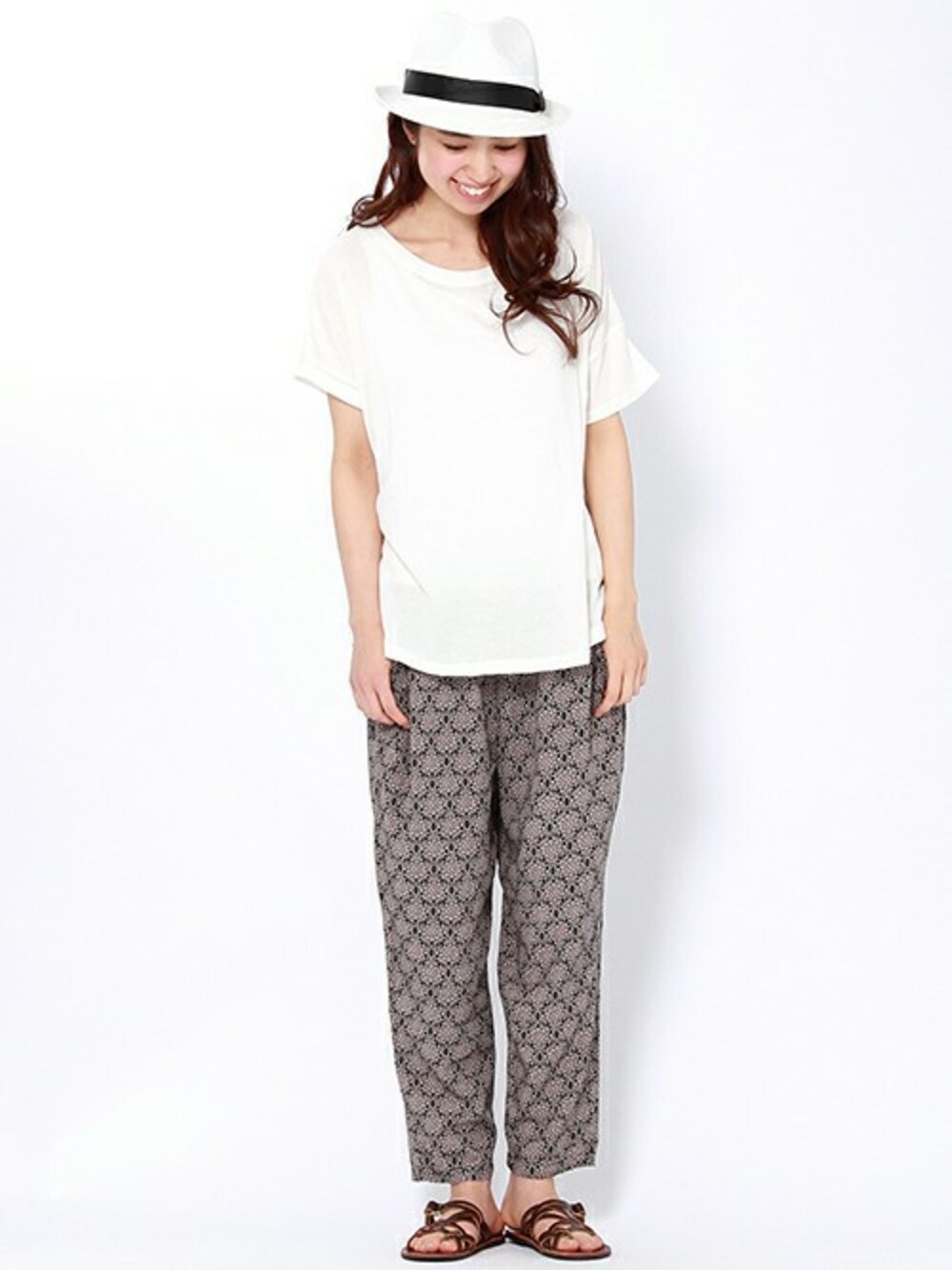 大人っぽい落ち感のある柄パンツに、さらりとラフなTシャツを合わせました。 夏らしい白ハットがアクセント。 気張らずにかわいいおすすめのコーディネートです。