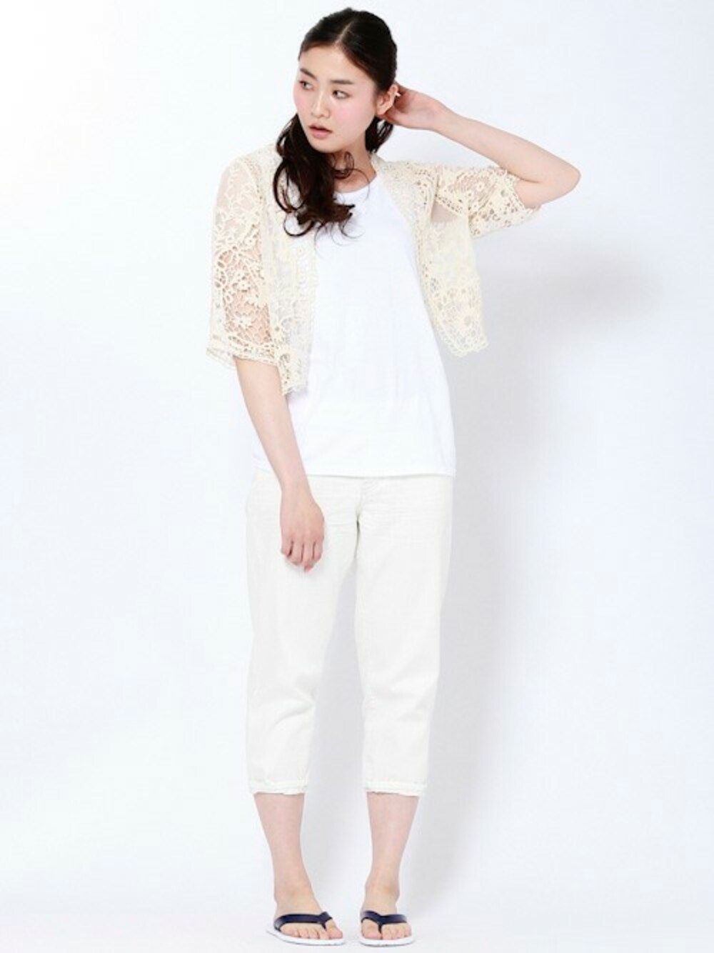 トレンド感のあるオールホワイトコーディネート。軽やかな総レースボレロが女性らしさを引き立ててくれます。 足元は「HENRY&HENRY」のビーチサンダルでラフに仕上げました。