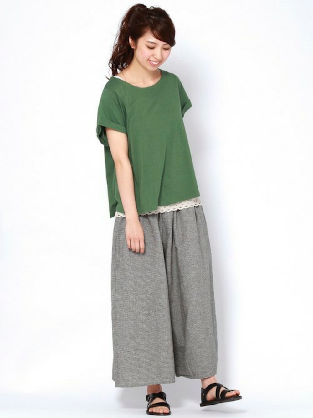 ラフなシルエットの大人カジュアルコーディネート。 タンクトップの裾レースがかわいいアクセントになっています。 ちょうどレースが見えるように計算されたプルオーバーと2枚セットのおすすめアイテム。