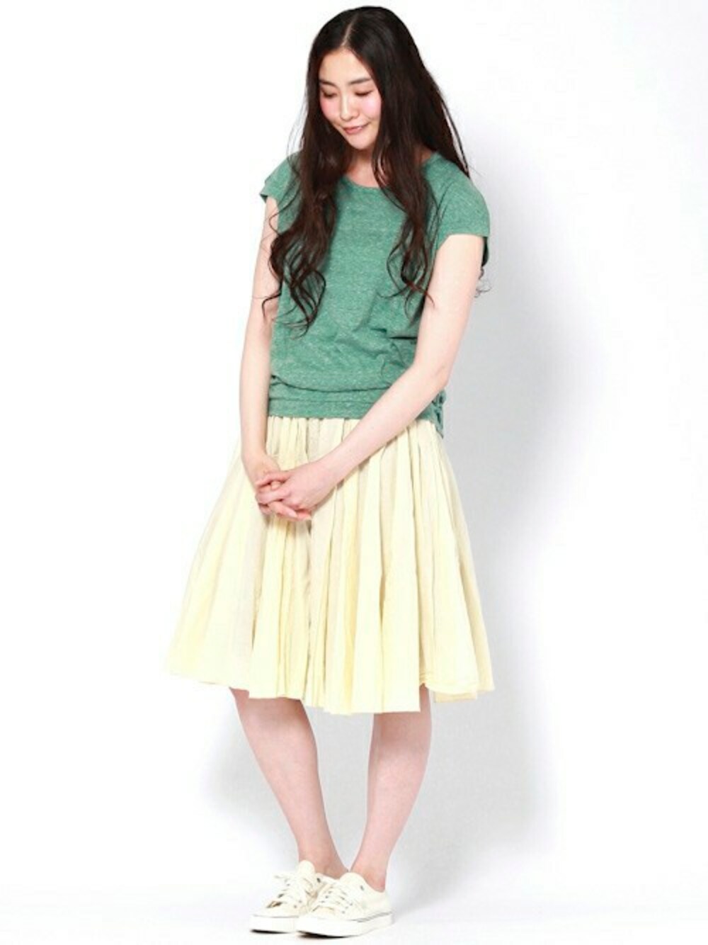 シンプルなTシャツにたっぷりギャザーのスカートを合わせました。 何枚持っていても重宝するTシャツは、ウエストがキュッとくびれているのでスカートと好相性。足元はスニーカーでカジュアルダウンしています。