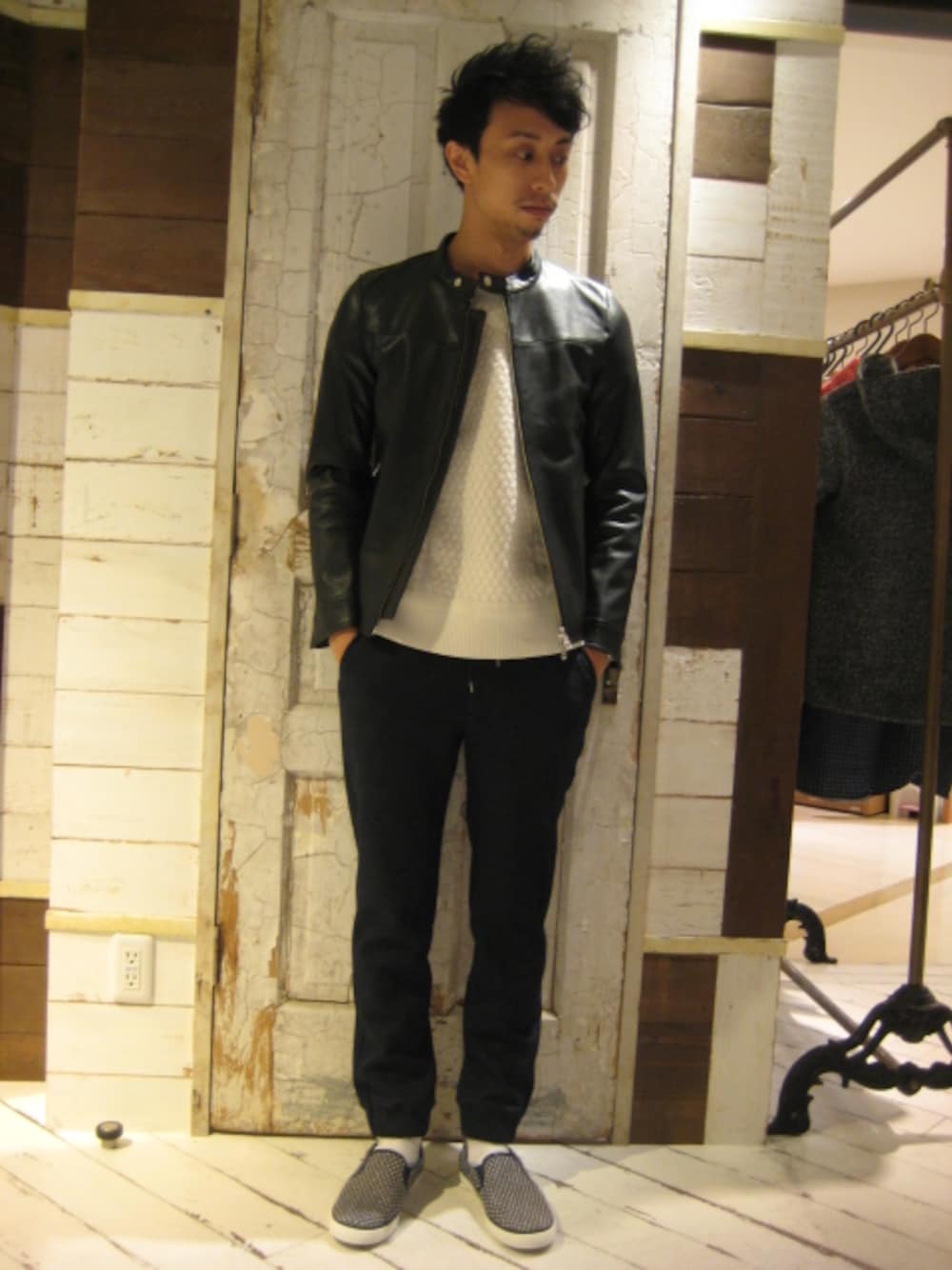白のニットやリブパンツでレザーのハードな印象を抑えたコーディネートです。