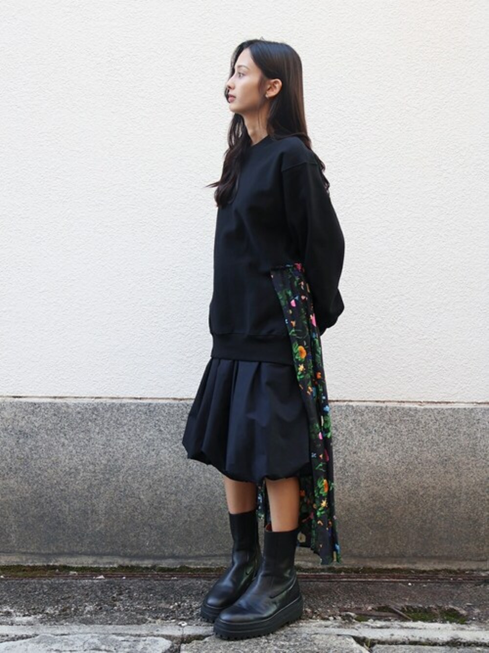 <ITEM> □ボタニカル柄プリーツ切替スウェット □ミディ丈バルーンスカート【Made in Japan】 ********************* STAFF:サキ 年齢:20代 身長:159cm *********************