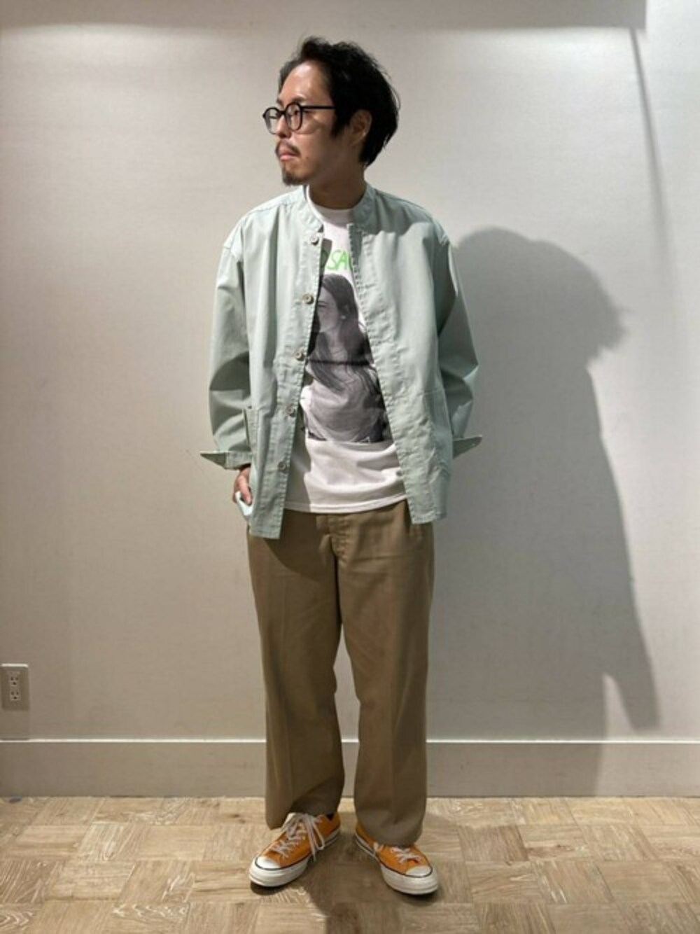 プリントTとシャツジャケットの色を合わせた春らしいコーディネート 173センチ Lサイズ着用