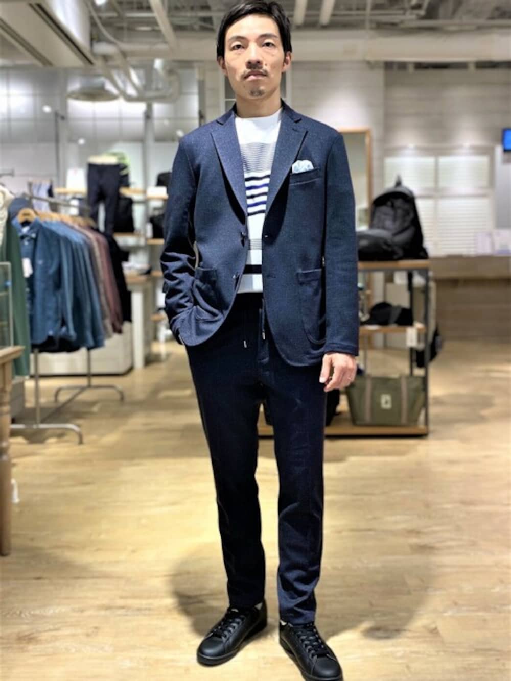 ジャージ素材のセットアップになります。 見た目はパリっとしておりますが、ストレッチが 効いているのでストレスなくご着用いただけます。