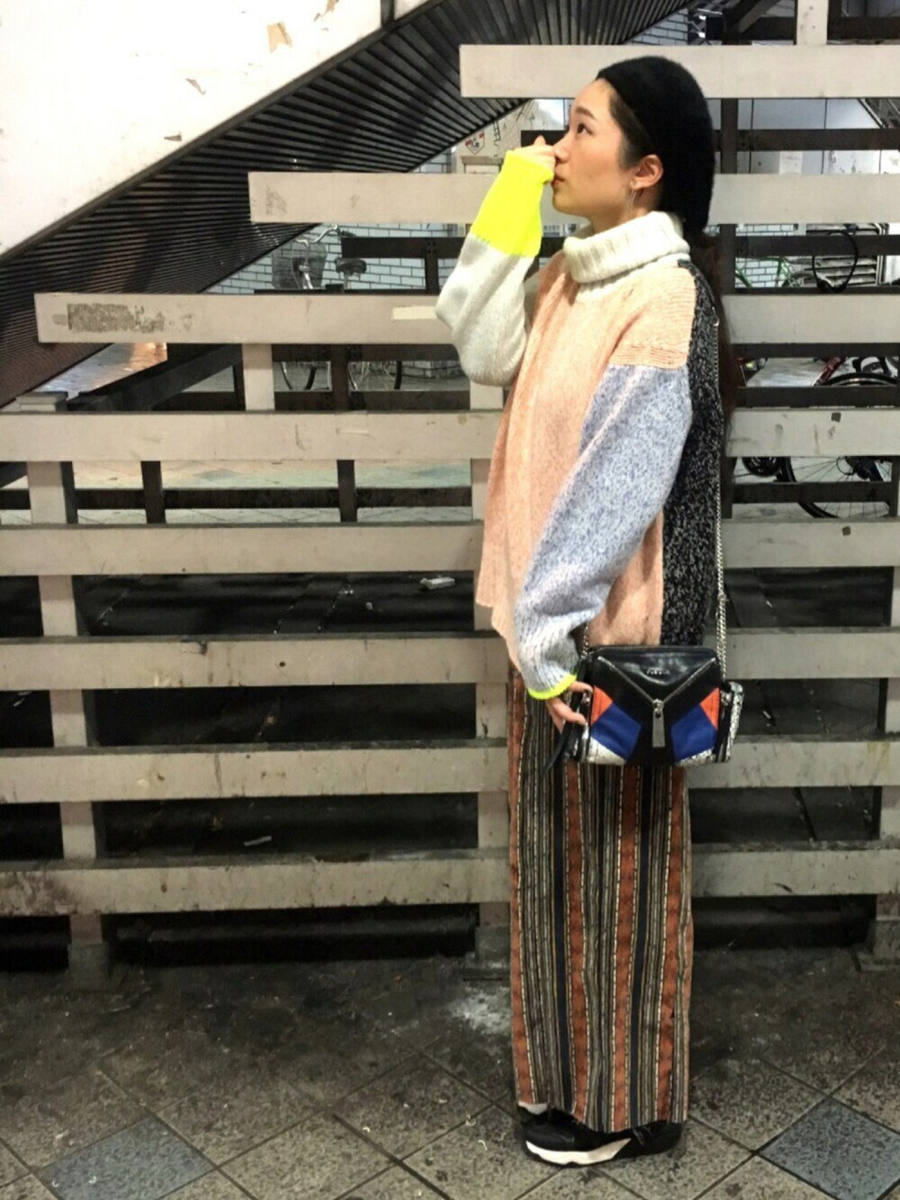 冬でもカラフルコーデ🍭 一目惚れしたGALERIE VIEのニットに 古着屋さんのワイド過ぎたワイドパンツを 自分で詰めて程よい太さに🖖🏻笑 この柄でコーデュロイでラクチンで優秀です🐻 DIESELのチェーンショルダーのお色味がバッチリ合って ゴキゲン👫 ニットが首元までくるので、 髪は後ろでひとつにまとめました👍🏻