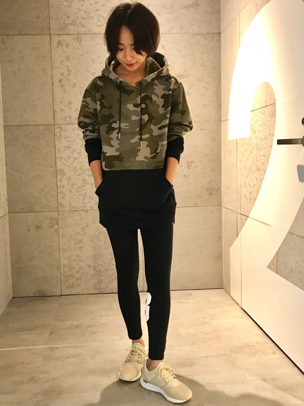 新作のメンズパーカーを使ったミリタリーコーデ。 メンズのMサイズ着用で、ゆるっとチュニック風に。 大き目フードは肉厚なので立つ上がりが綺麗ですよ。 シューズはウィメンズの247からミリタリーテイストに馴染むベージュをチョイス!