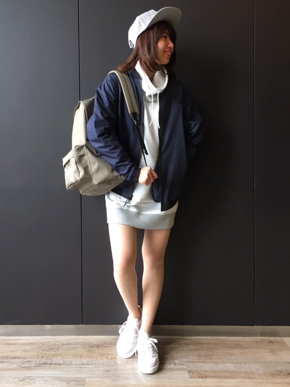 春の通学コーデ 着まわしのきくボンバージャケットは、朝夕が肌寒い今の季節に重宝しますよ♩ メンズのジャケットですが、Sサイズは女性でも丁度良いサイズ感です。 スウェット生地のトップスは丈が少し長めなので、サイズを上げると1枚で着ることが出来ます。 NBキャップとロゴリュックでスポーツ感アップ♩ らくらく快適に通学できるオススメコーデです。
