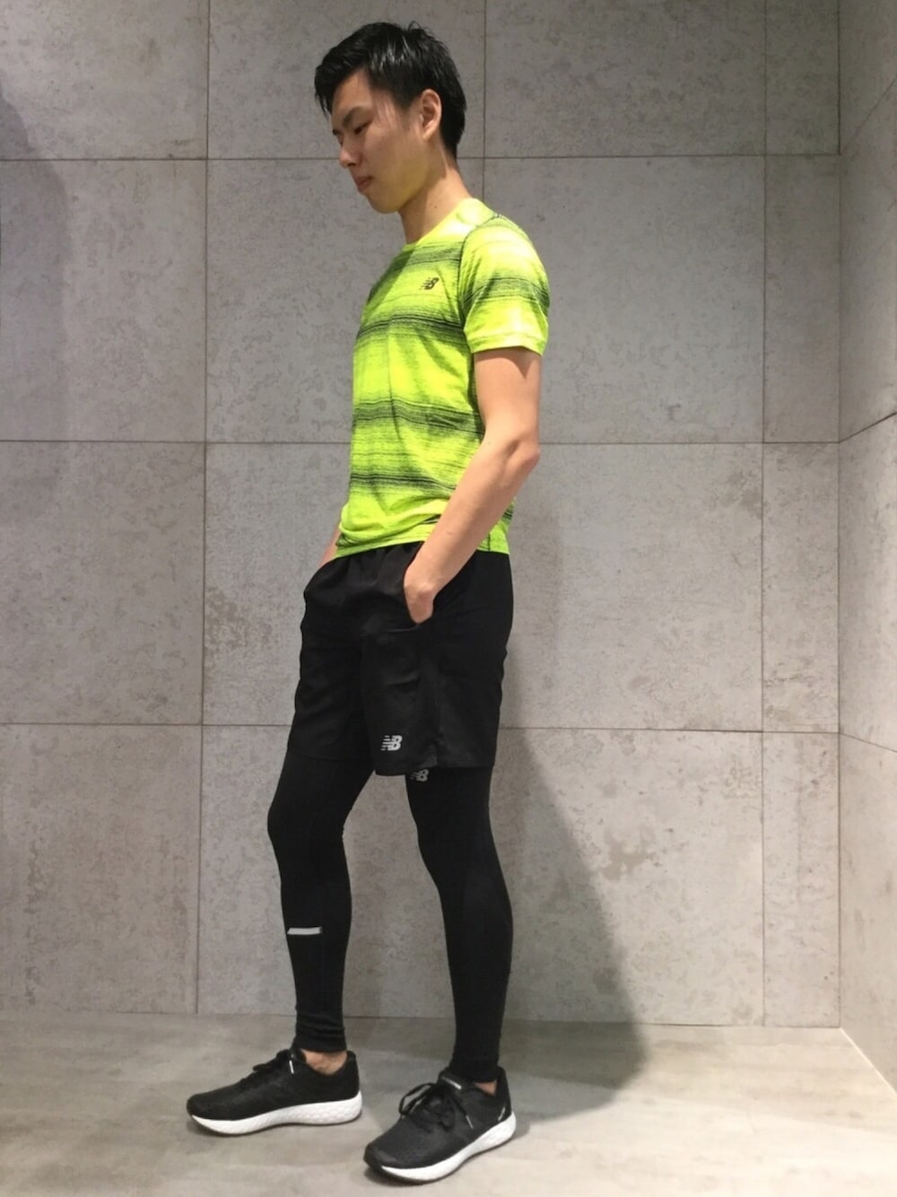 流行のネオンカラーがポイントのランニングコーデ。 あえて他のアイテムは黒で統一させてみました。 メインのTシャツは裏地を立体に編んでいるので、汗をかいても身体に張り付かない素材です。 ストレッチ性も優れており、柔らかい肌触りが快適です。