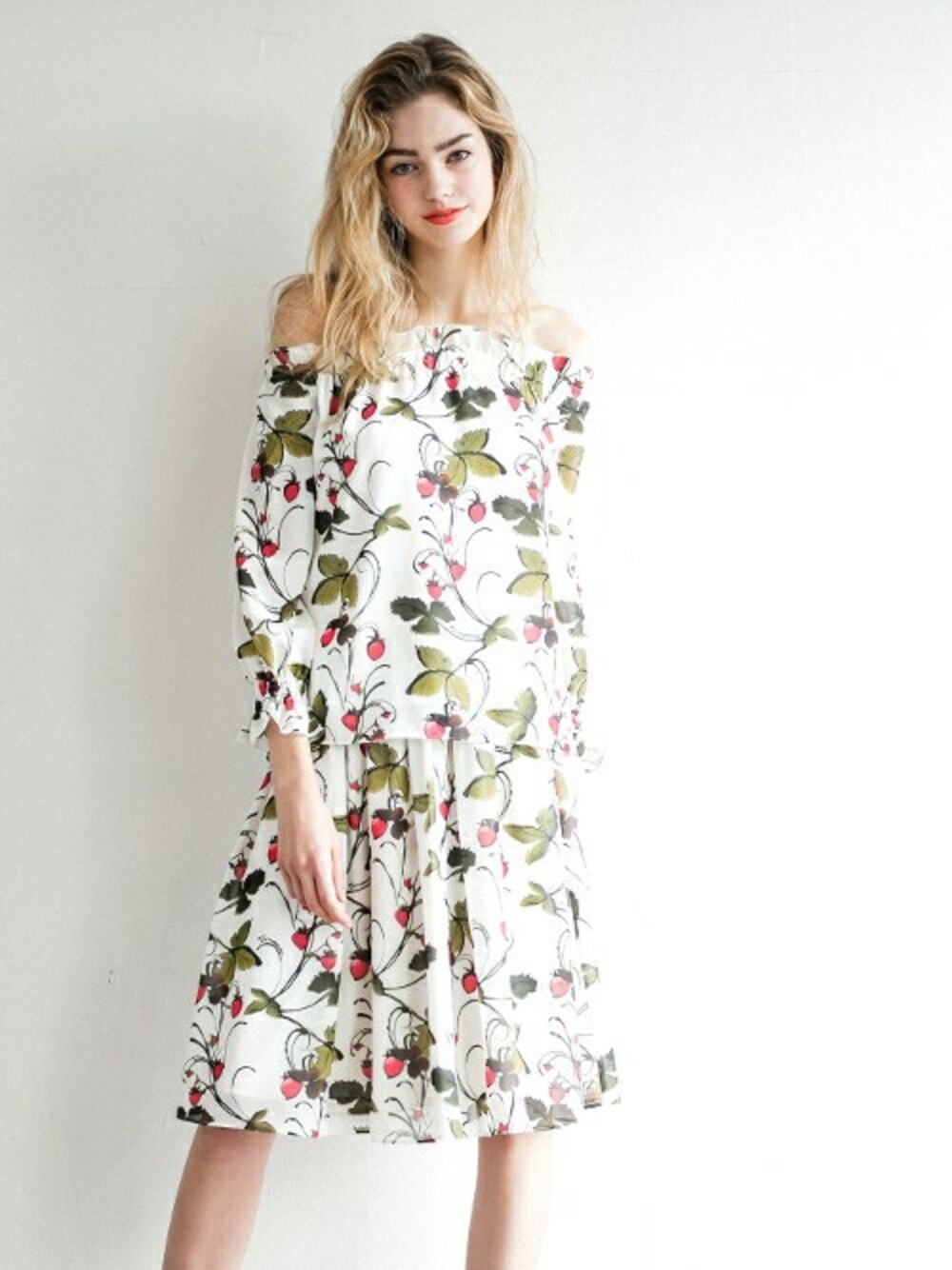 Ninamewのシャツ/ブラウス「ストロベリープリントオフショルブラウス」を使ったコーディネート