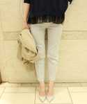 甘く見えがちなレースアイテムもVネックのシルエットとカーキのカラーをチョイスすれば、品よく、大人らしく! ストライプのパンツと合わせて、より旬なスタイリングに。