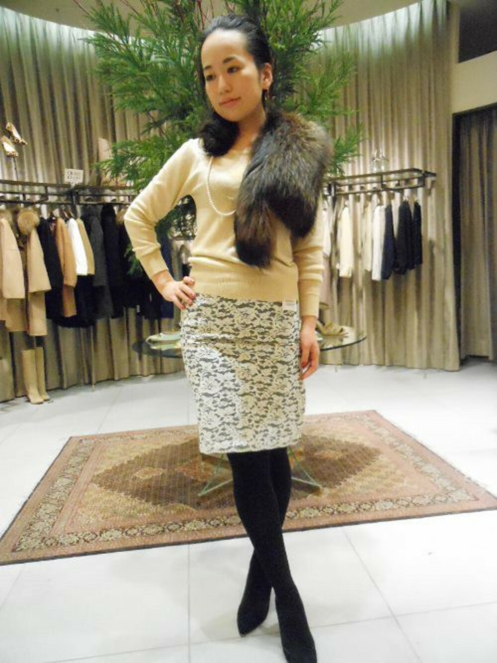 大人気のレーススカートに新入荷のスパンコールニットを合わせたパーティーもOKなスタイリング! さりげないキラキラ感で華やかさをアップ♪