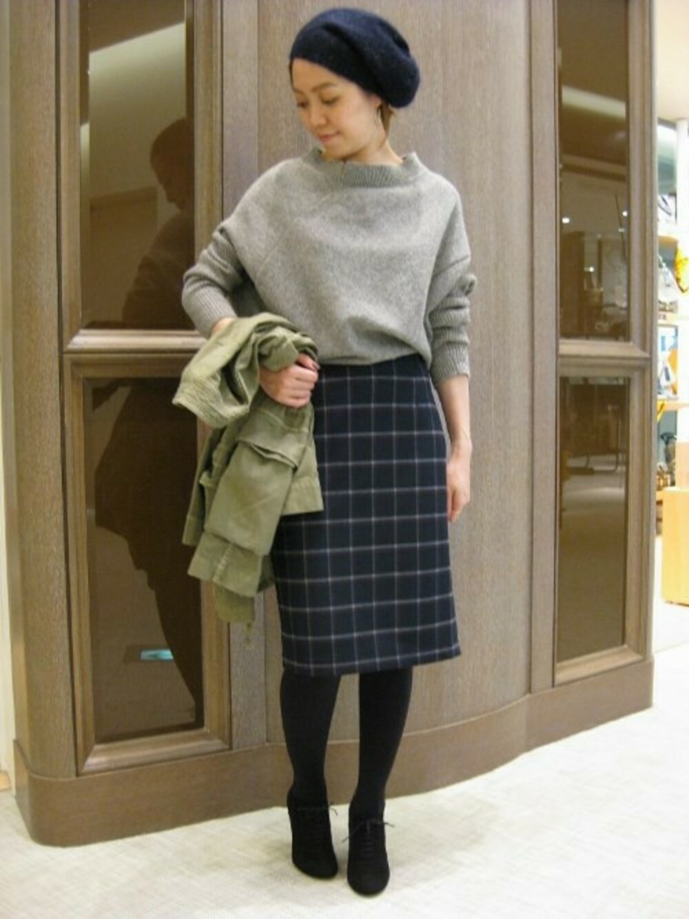 子供っぽくなりがちなチェック柄のスカートを大人カジュアルにスタイリングしました。 タイトスカートは今シーズンのトレンドアイテム!トップスもコンパクトにまとめてアイラインシルエットで スタイルアップ♪