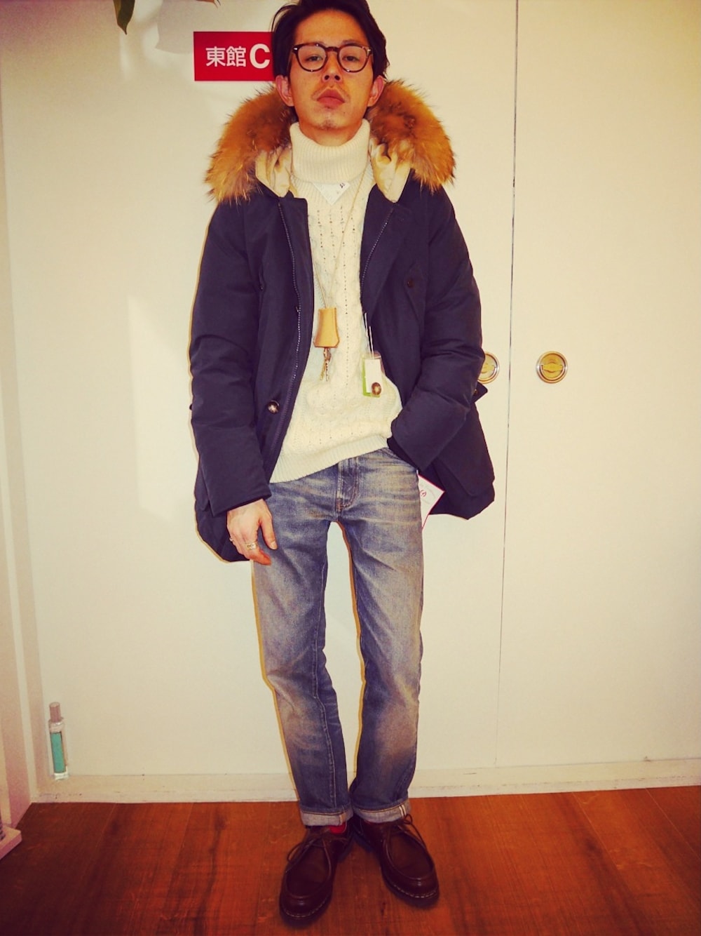 雪降る寒い日も、アランニットに極上ダウンで防寒バッチリですが、キレイなアイテムと、男っぽいアイテムのバランスを整えてあげると良いかと思います! 色落ちしたデニムでヌケ感があると良しかと!