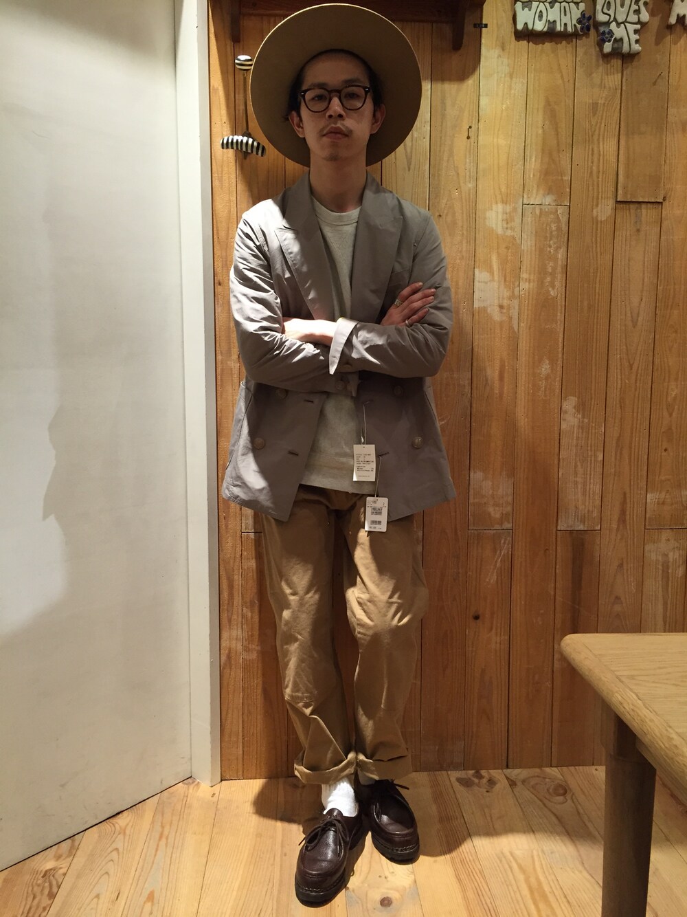 ベージュ×グレーは鉄板カラー! 新作のティムのダブルジャケットを、スウェットとワークパンツでハズす! パンツは、Franklin Tailored シューズはParaboot
