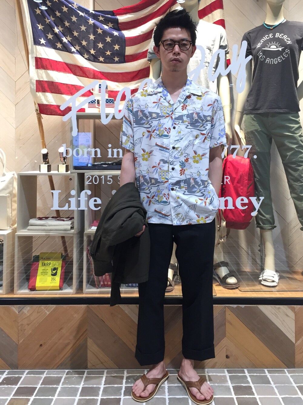 スラックスにアロハシャツ。大人のスタイリングでおススメです。