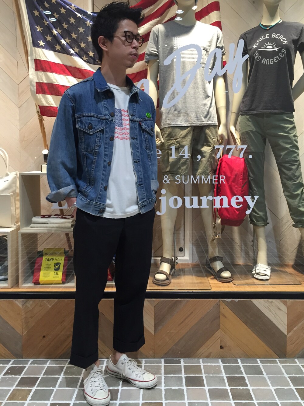 ちょっと肌寒い日は、Tシャツの上にさらっとジージャン。スラックスでハズすのがオススメです!