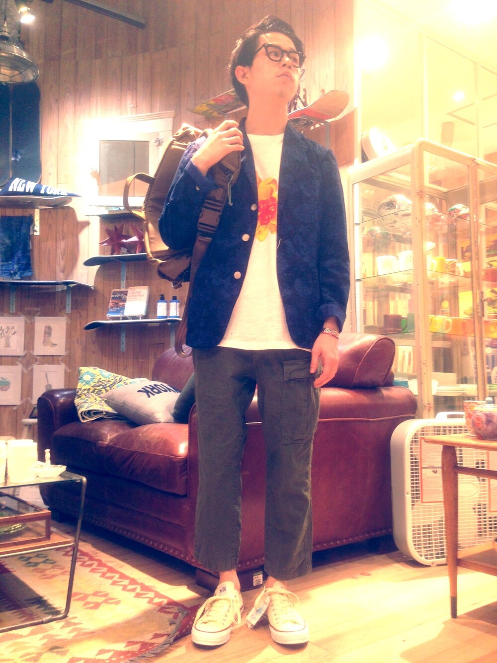 ジャケットとTシャツにトロピカルプリントを重ねました。 ミリタリーパンツと、MYSTERY RANCHのメッセンジャーバックで男臭くトロピカルを、着こなす!がテーマ。