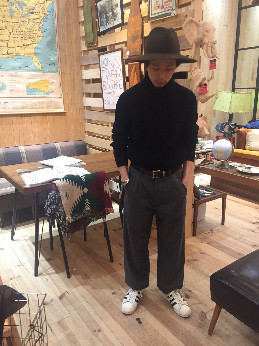 ワイドパンツにタックイン。変化のある着こなしがお好きな方にオススメです。