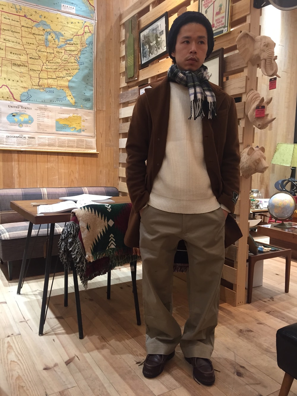 チェスターを大人のスタイリングで合わせてみました。シンプルとカジュアルさがポイントです。