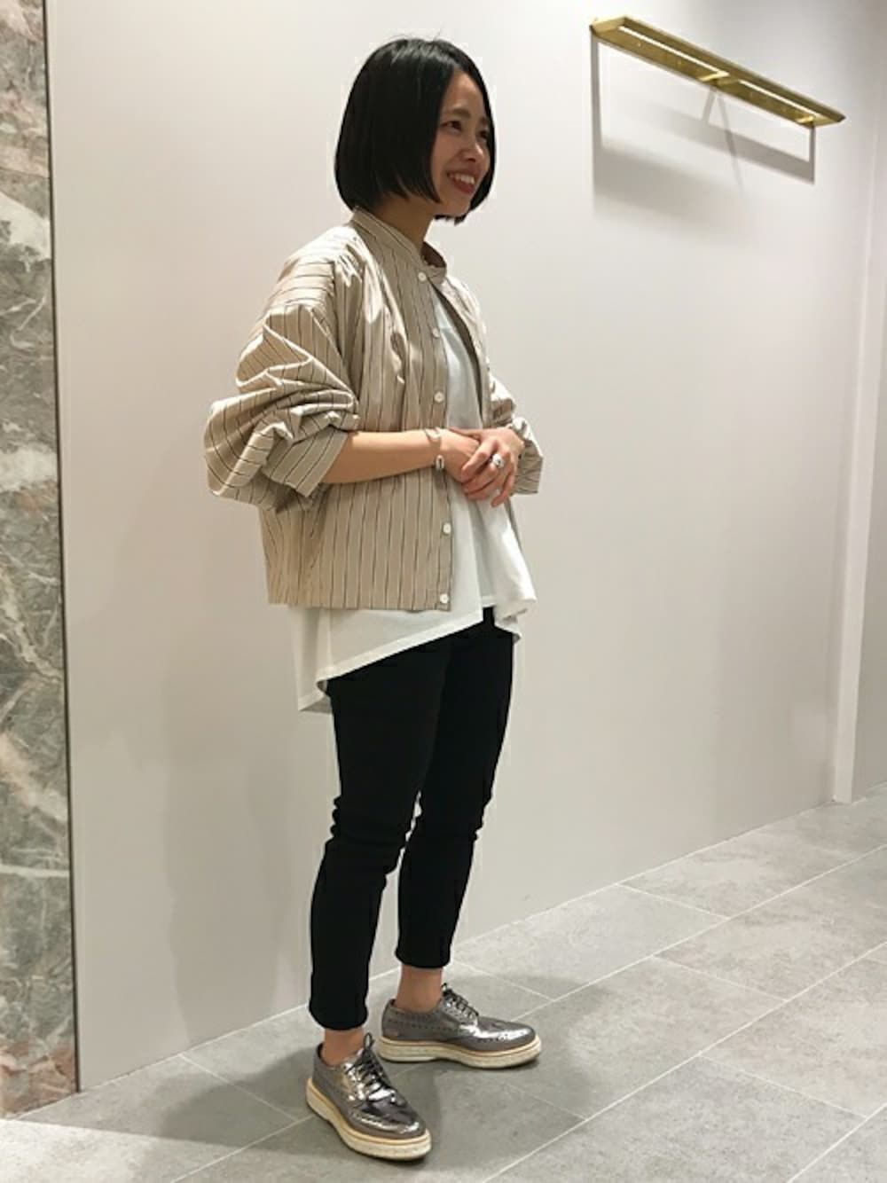 小田 なつ美のシャツ/ブラウス「ASTRAET(アストラット)ストライプ ギャザー ボリュームスリーブ ブラウス」を使ったコーディネート