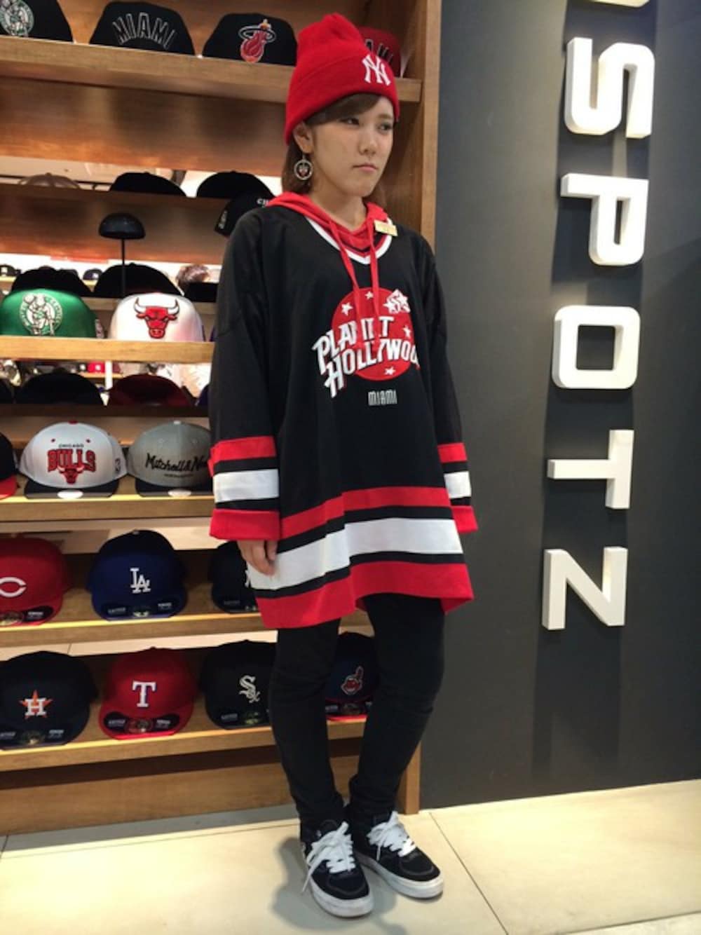 ONSPOTZ_STAFFのニットキャップ/ビーニー「NEWERA KNIT CAP TEAM LOGO NEW YORK YANKEES SCARLET」を使ったコーディネート